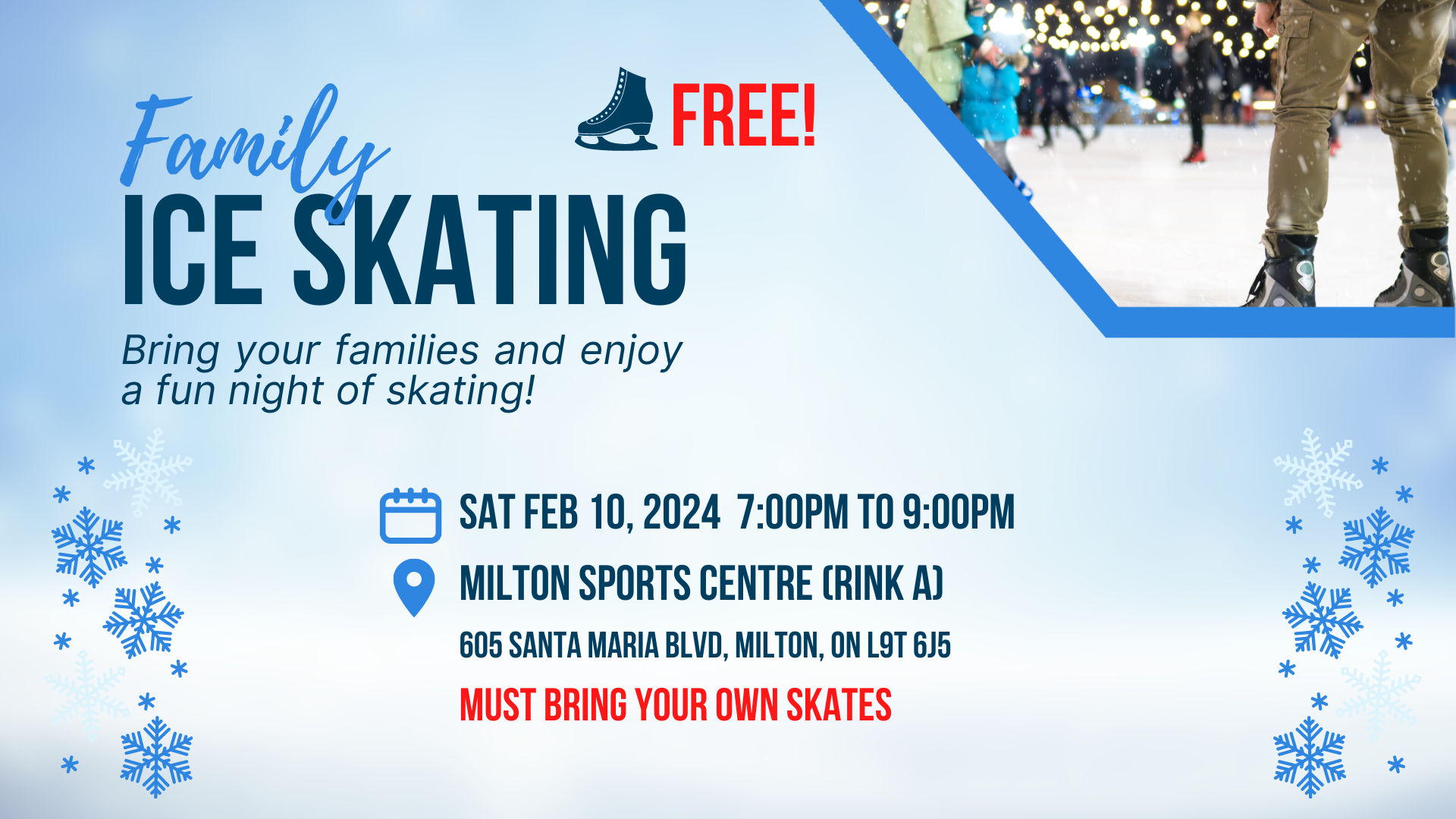 Join us for a fun filled evening at the Milton Sports Complex on Saturday February 10th @ 7:00 PM . Come enjoy some skating with family and friends while connecting with your community.